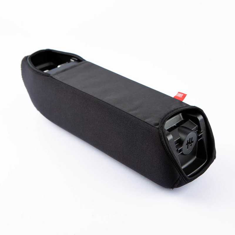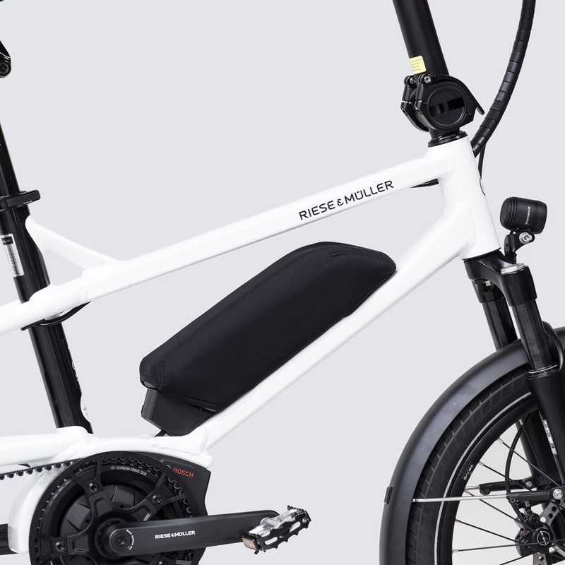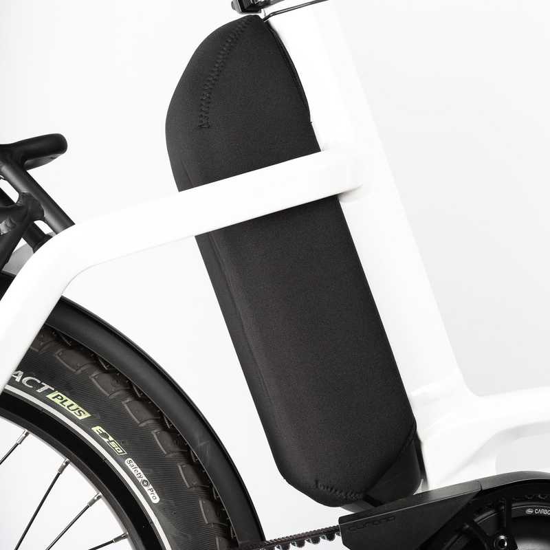 The neoprene ensures that the operating temperature of the battery is maintained, which means that the range of the e-bike can be increased even on cool days. The protective cover also functions as a practical transport protection for the battery when it has been removed from the frame. The lock, power button and charge level indicator are still accessible through the cut-outs on the side of the case.